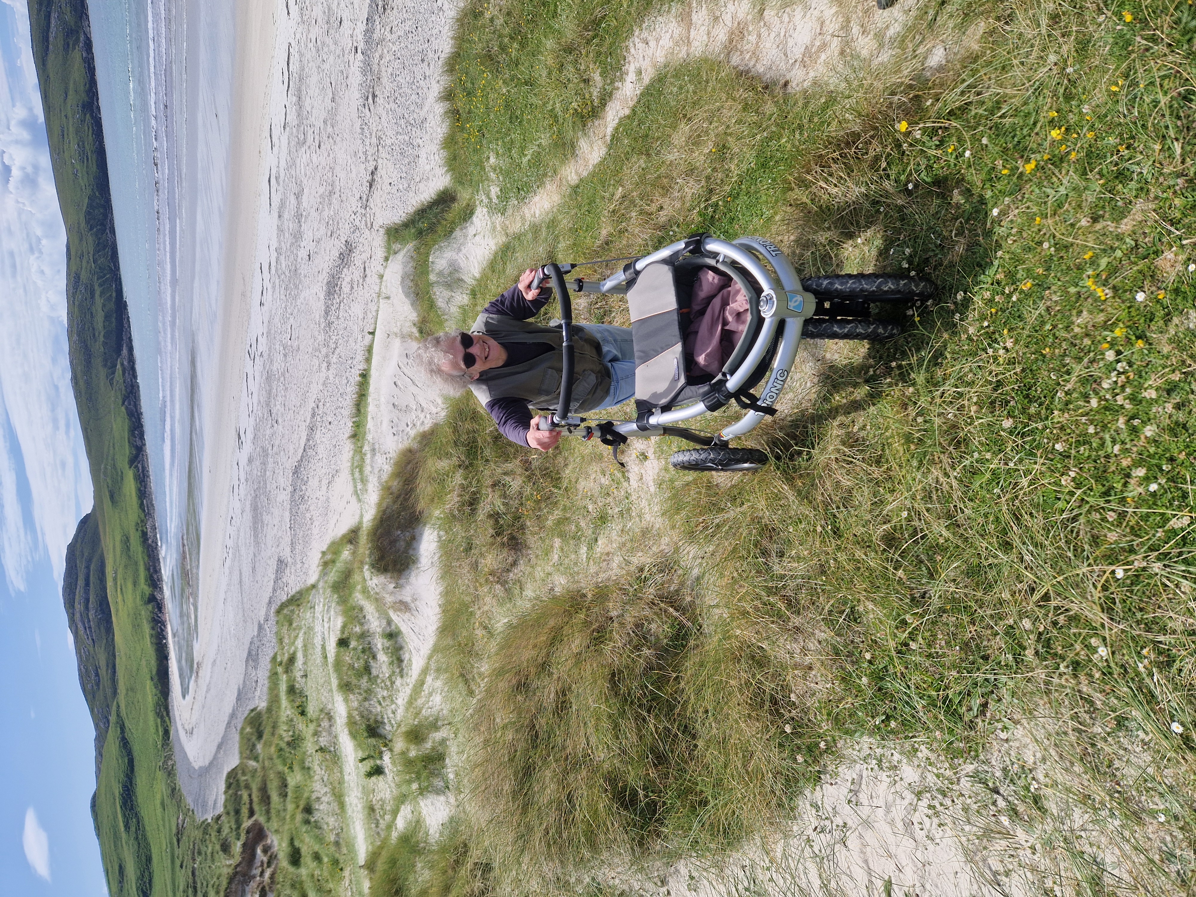 Już od jakiegoś czasu nosiłem się z zamiarem napisania do Ciebie podziękowania za całą pomoc, jaką daje mi mój Veloped – używam go do wieszania prania i wyciągania torfu z szopy, a także do spacerów po trudnym terenie na wyspie Barra na zachodnich wyspach Szkocji. Udało mi się nawet dotrzeć (z pomocą w planowaniu trasy) na plażę, której myślałem, że już nigdy nie odwiedzę, ponieważ otaczają ją bardzo wysokie wydmy. Załącznik pokazuje, jak wracam na górę; plaża to Tràigh Siar na sąsiedniej wyspie Vatersay.